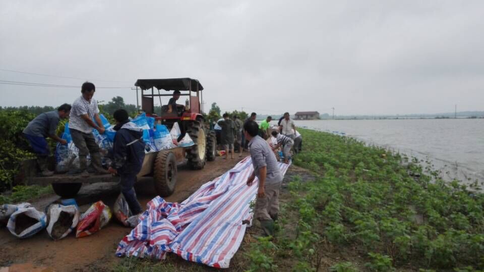 太白湖村是个典型的水袋子村,田多地少,防汛用土资源馈乏,经当地村干部协调才在一家民宅前的一块菜园地里取土,根据当地防汛指挥部统一安排美天防汛突击队专门负责取土装袋,运至拖拉机上,当地干群则负责将运来的沙包筑子堤。在现场笔者看到整个劳动场面没一个闲人,铲土的铲土,牵袋口的牵袋口,扛包的扛包,只听见铁锹铲土发出阵阵沙沙的声响,大家心系灾情,劳动热情高涨,踩着泥泞,来回穿梭,身上,脸上被泥水、汗水染黄了,有的同志手上被铁锹柄磨起了血泡,但未见他们叫一声苦,道一声累,截至笔者发稿时止美天生物抢险突击队取土九车,共45吨,累计1286袋。