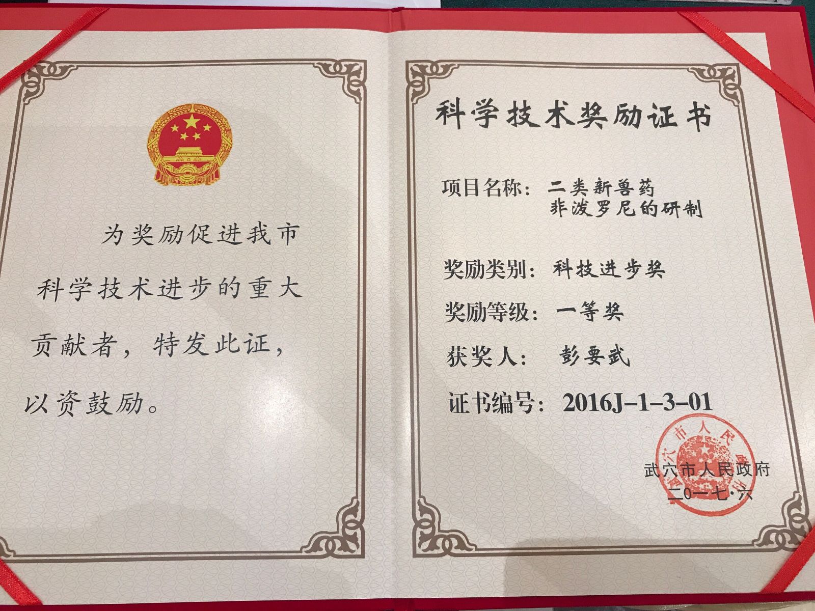 云开在线_云开在线(中国) 荣获“武穴市十佳科技创新企业”的荣誉称号,公司董事长兼总经理彭要武先生被评为“十佳创新人才”,企业申报的二类新兽药非泼罗尼的研制项目被评为“科技进步一等奖”。参会领导及各组成员对获奖企业和个人表示了热烈的祝贺和高度的赞扬。